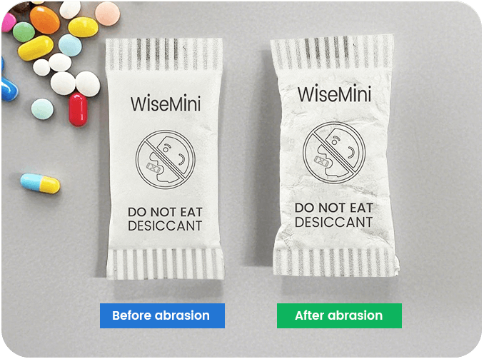 To simulate the friction that may occur during transportation, we tested the surface of the desiccants under abrasion. We found that traditional desiccants exhibited ink shedding and flaking under strong friction, while our ink-free & glue-free desiccants remained intact with clear labeling.